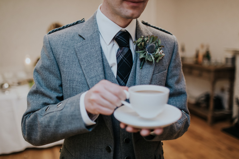 The vibe for the day was a relaxed one. Becky wore a gorgeous lace gown by Maggie Sottero which she managed to find second hand on eBay. The beautiful bouquet and boutonnières were from the wonderful Hay’s Flowers. Becky even booked her hair appointment on the day and managed to get some pampering from Millionhairs in Aboyne. Val Morrison did an absolutely phenomenal job of catering and using local produce, the wedding party sat down to an extraordinary five course meal. I can verify that it was absolutely delicious. The cake was rosewater and pistachio and came from Kember and Jones in Glasgow.